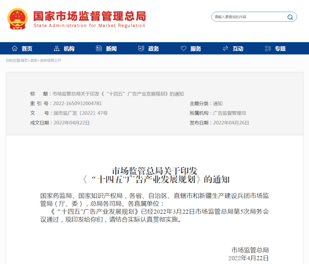 近日,市場監(jiān)管總局印發(fā)《“十四五”廣告產(chǎn)業(yè)發(fā)展規(guī)劃》(以下簡稱《規(guī)劃》),系統(tǒng)謀劃“十四五”時(shí)期推動(dòng)廣告產(chǎn)業(yè)高質(zhì)量發(fā)展相關(guān)工作。